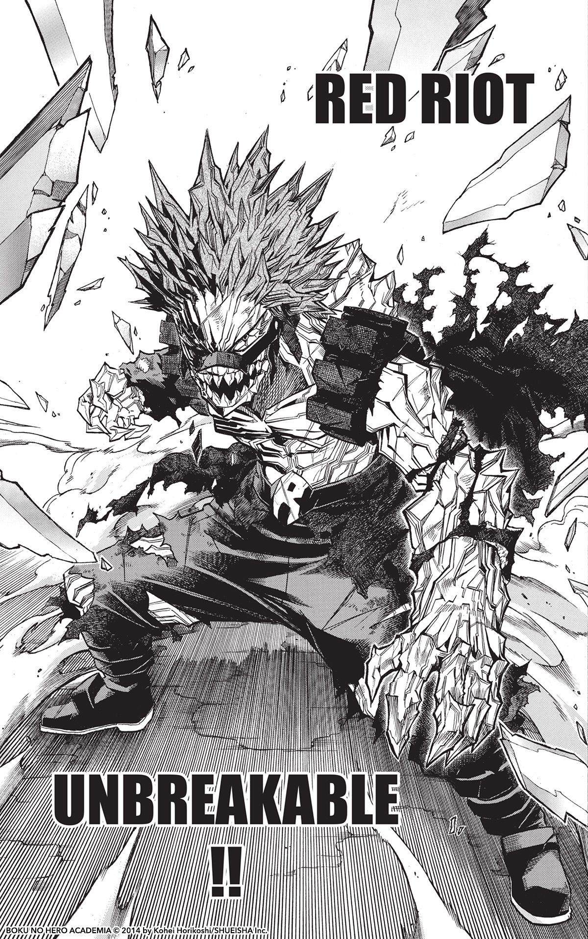 A boy with red hair and eyes is standing in front of him, grinning with a mouthful of razor sharp teeth. His body slowly transforms--his quirk--his skin becoming hard and almost rocky looking. His fingertips sharpening to look like claws. Everything about him sharp and dangerous looking. But his voice is friendly and excited when he speaks. "I call this move... Unbreakable!!"